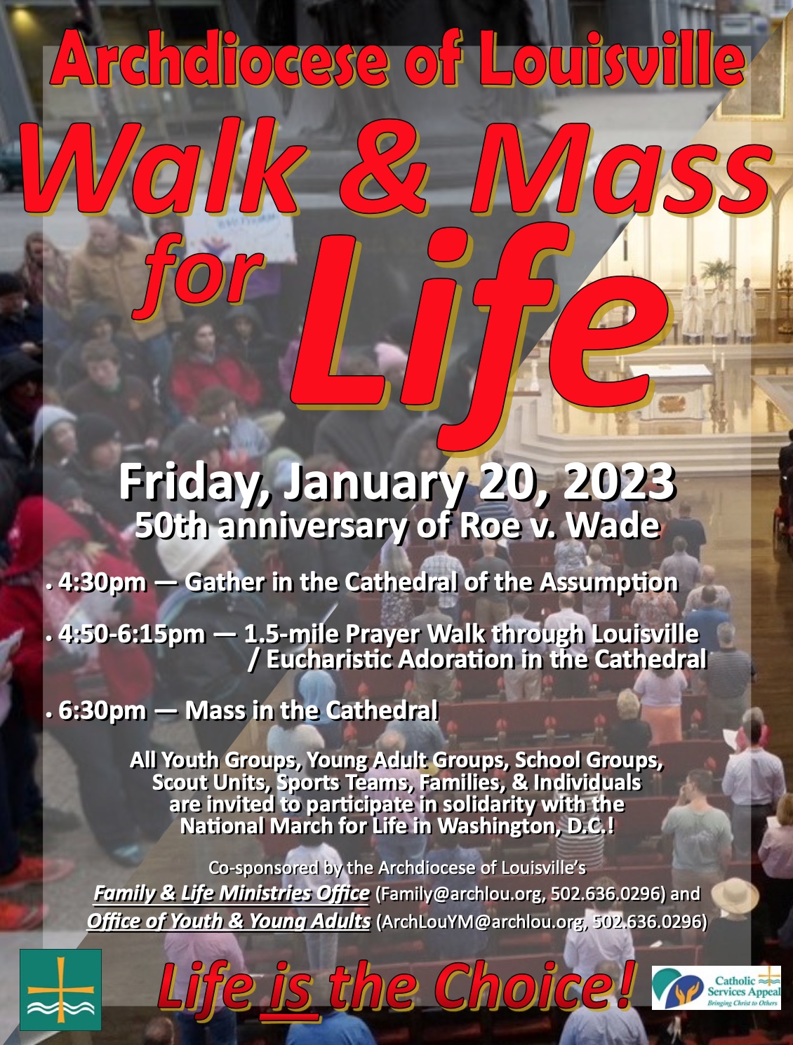 The local Mass and Walk for Life, observed in anticipation of the 50th anniversary of the Roe versus Wade decision (January 22, 2023), will be held on Friday, January 20 beginning at 4:30 p.m. All youth groups, school groups, scout units, sports teams, families, and individuals are invited to join in solidarity with the National March for Life in Washington, D.C. Participants will gather at the Cathedral of the Assumption (433 South Fifth Street, Louisville, Ky. 40202) at 4:30 and then proceed on a 1.5-mile prayer walk through Louisville followed by Eucharistic Adoration and a Mass at the Cathedral. The Very Rev. Martin Linebach, Vicar-General and rector of the Cathedral, will preside at these liturgies.